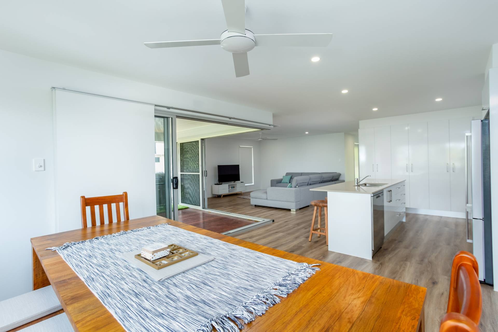 Indoors and outdoors combine seamlessly with large sliding doors that can be fully opened to create one huge living space incorporating the living room, dining area, kitchen and beautiful back deck. Relax and enjoy your beachside escape with family and friends whilst looking out across natural bushland from the outdoor entertainment area.