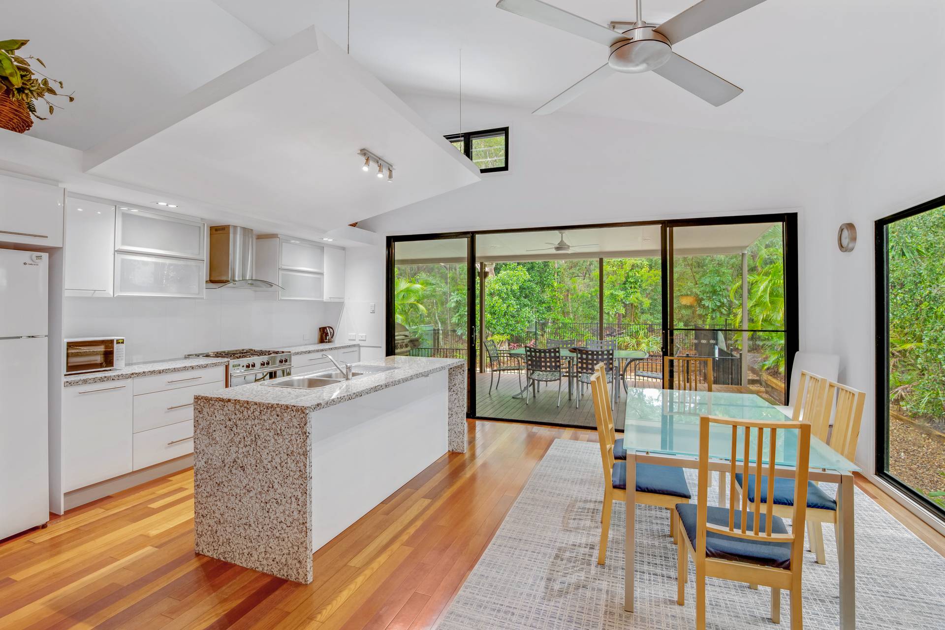 The spacious living area features a fantastic outlook of the natural bush and flows seamlessly onto the back deck, overlooking the inground pool.
