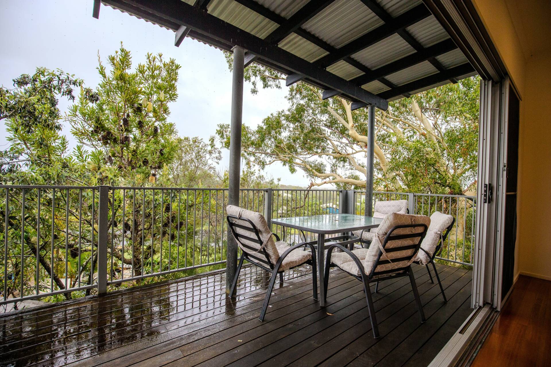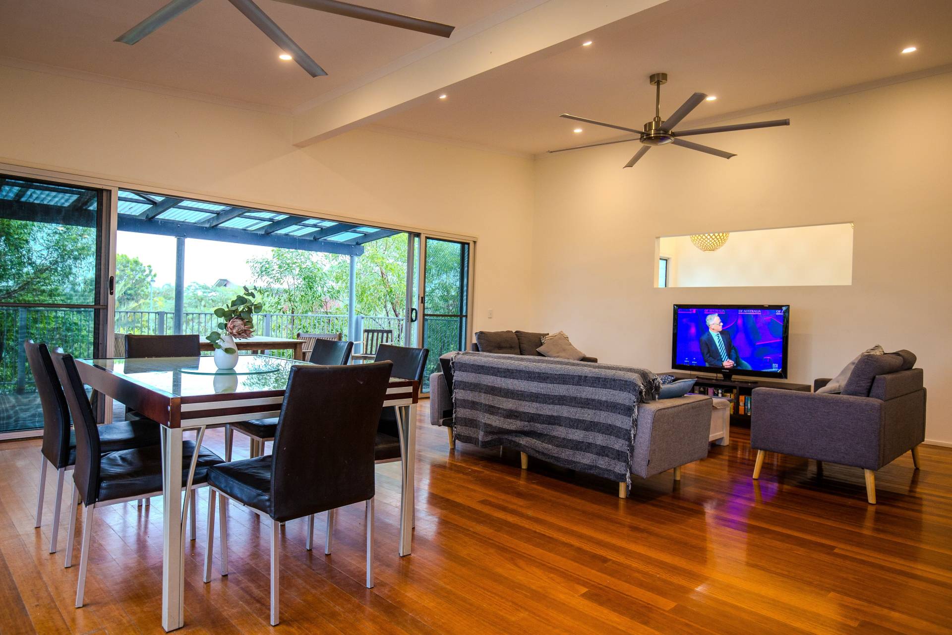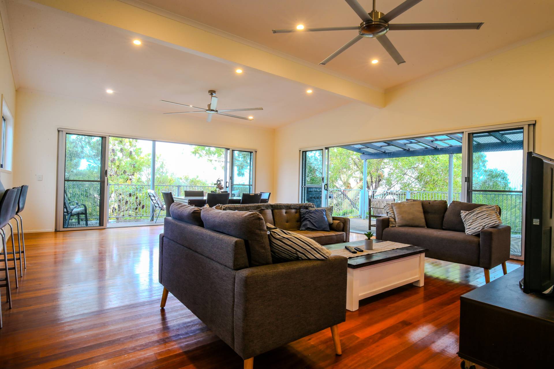 Living area with TV and DVD player opening out onto the deck
