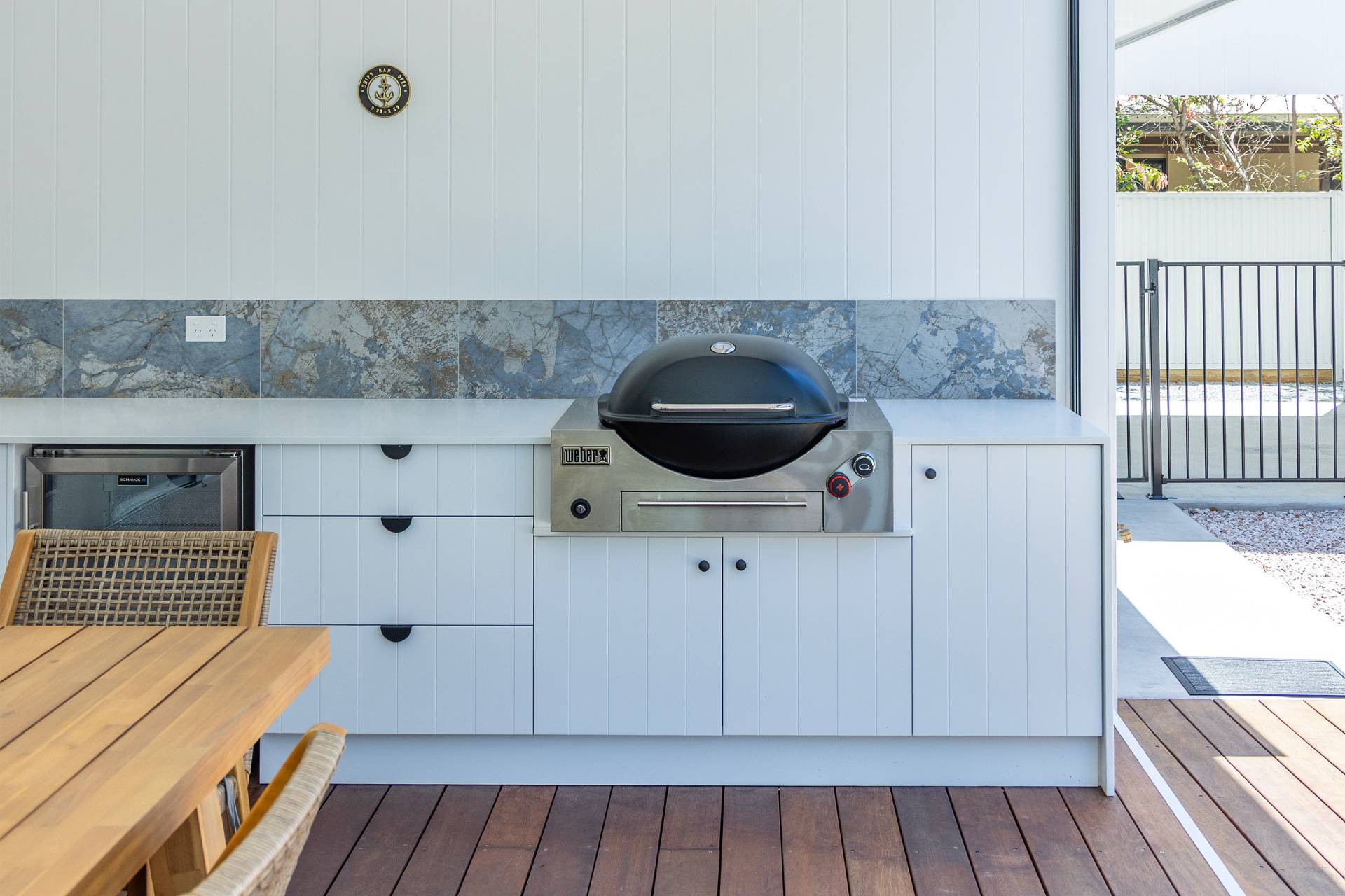 •             Outdoor kitchen with fridge, sink and gas barbecue