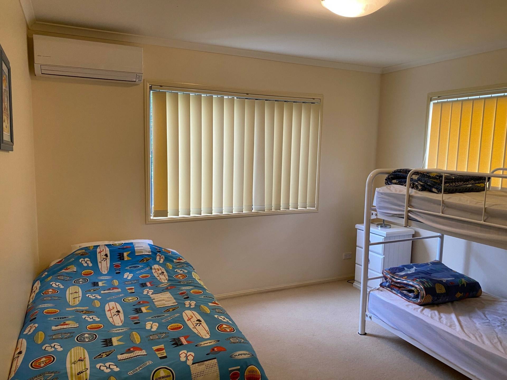 Sleeps seven in two queen size beds, single bunk beds and a single bed.