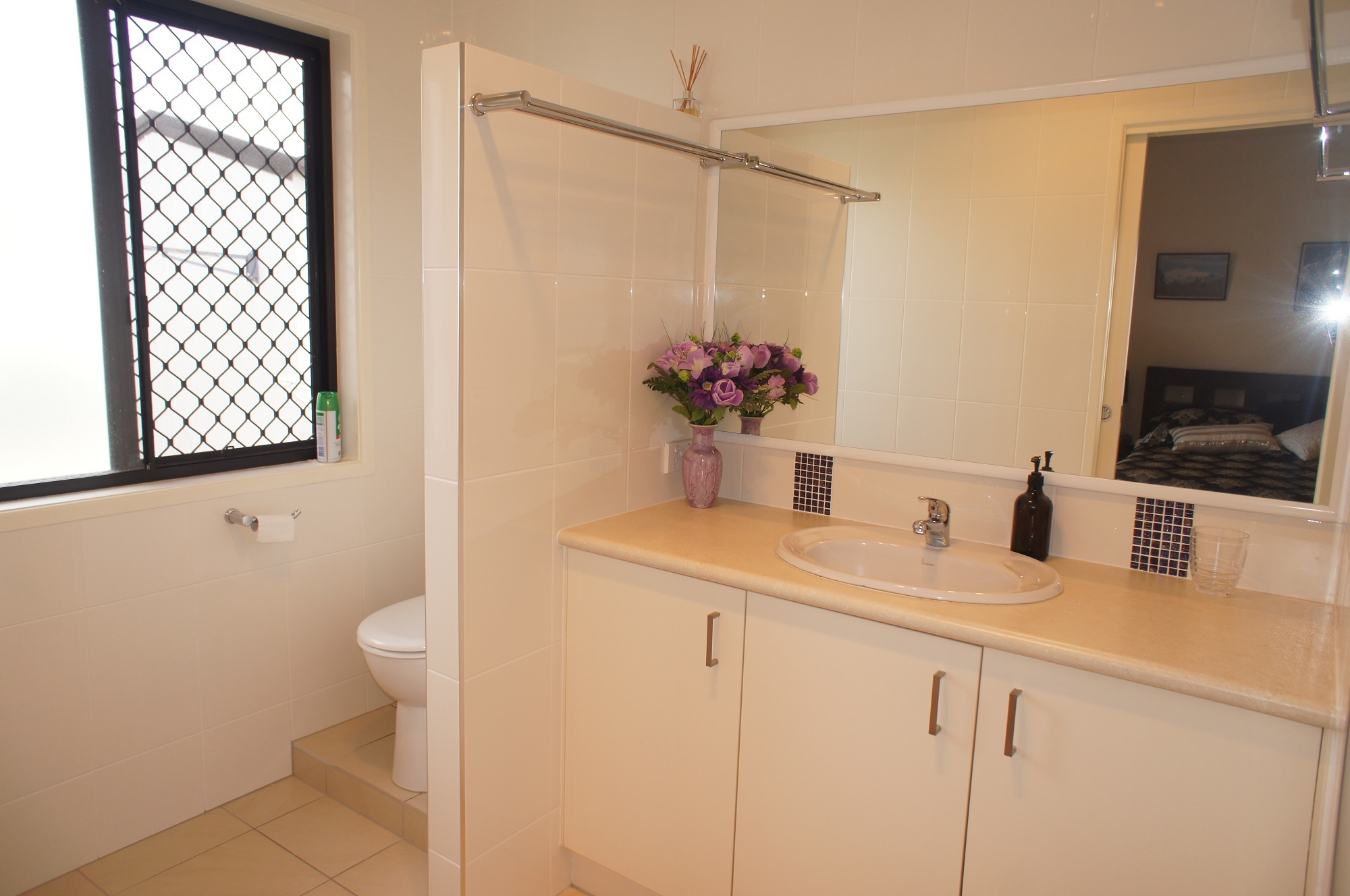 The main bedroom which consists of a king-sized bed, has an ensuite with a larger than life shower, vanity and hidden toilet.