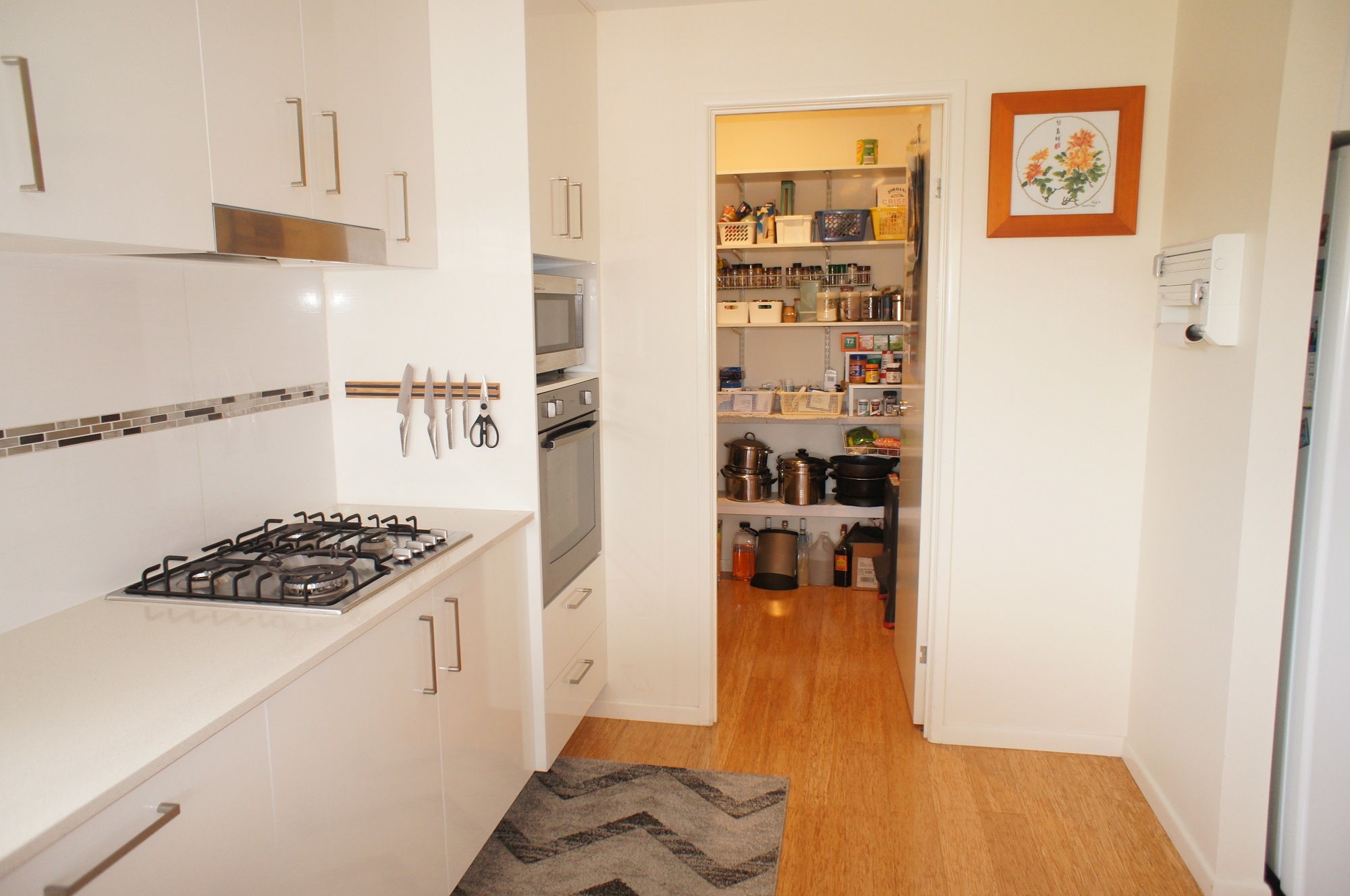 With all the bells and whistles of a modern contemporary home, including self-closing drawers, hidden dishwasher, walk-in pantry and refreshing bamboo floors.